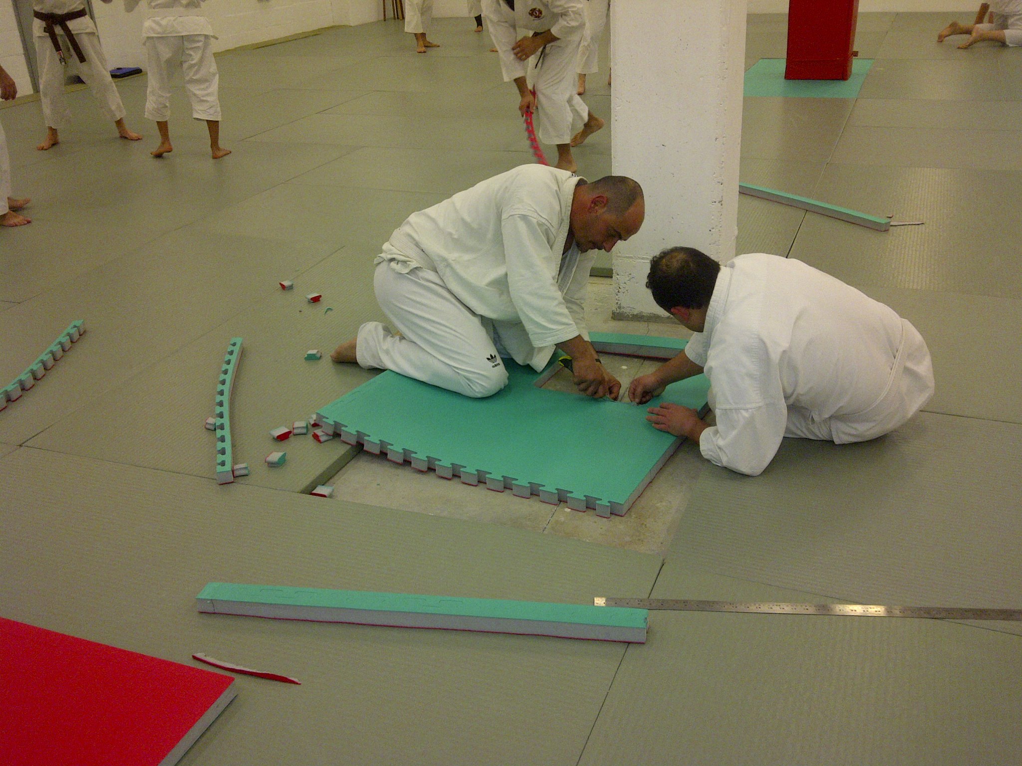 - Completamos el tatami, de forma que ahora ocupa todo el suelo. Para ello, además de colocar planchas que nos ha facilitado el PMD, hemos tenido que adquirir y recortar piezas específicas para completar espacios alrededor de los pilares y en los bordes. Aprovechamos la ocasión para levantar todo el tatami, limpiar a fondo y recolocarlo de la mejor manera posible.