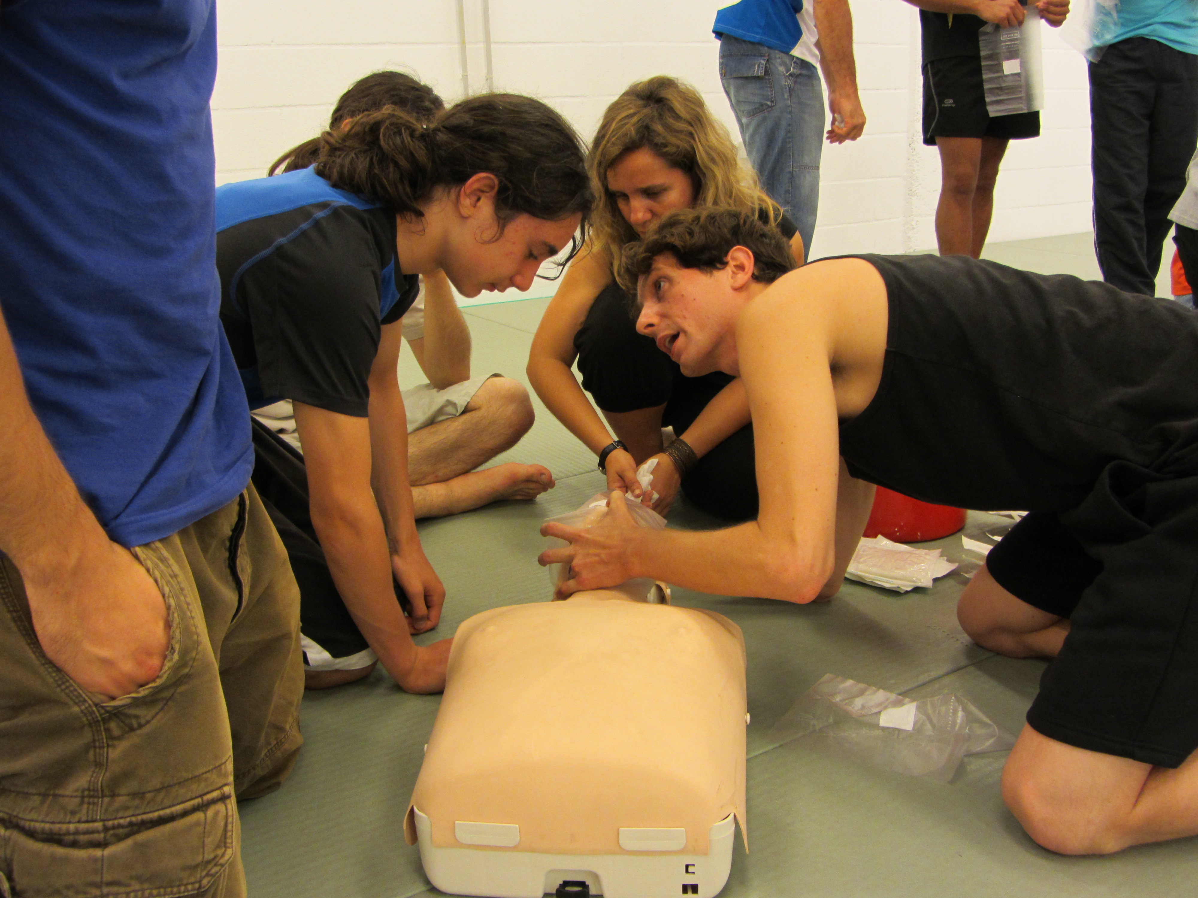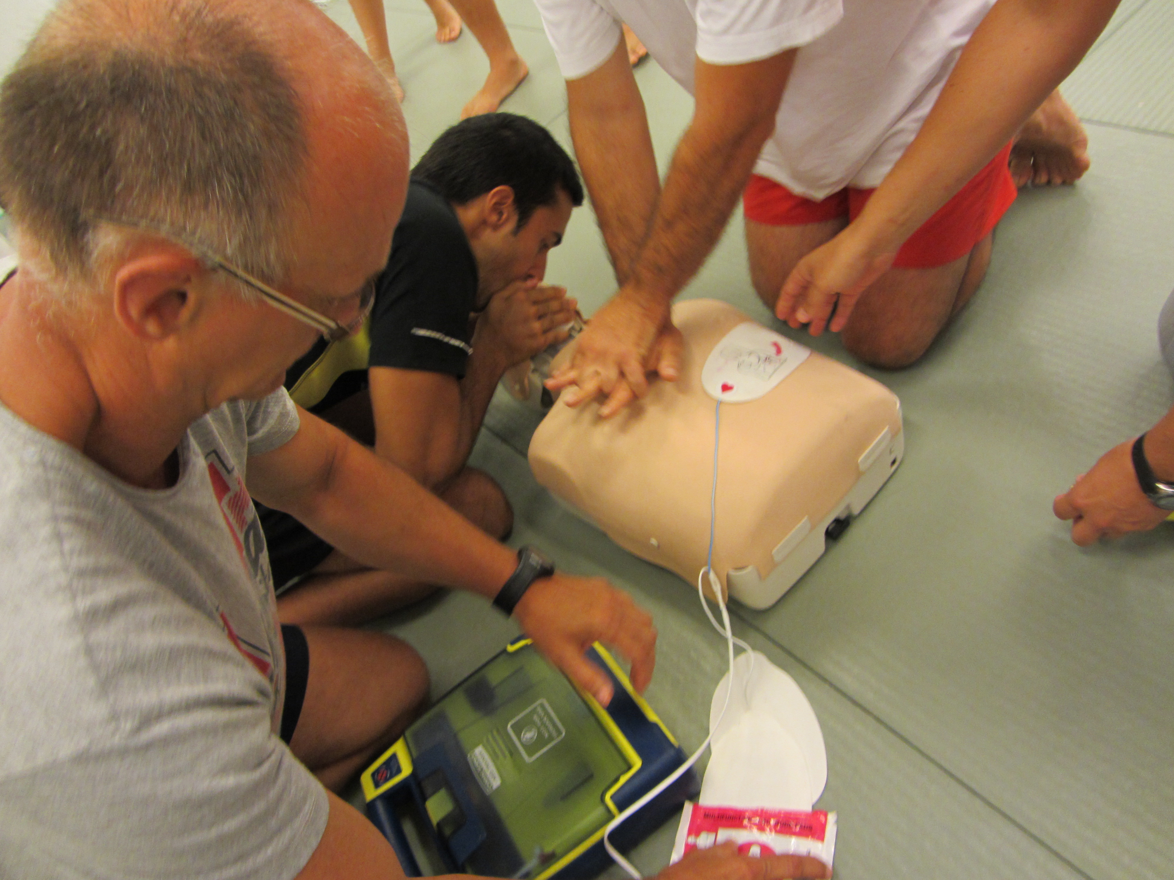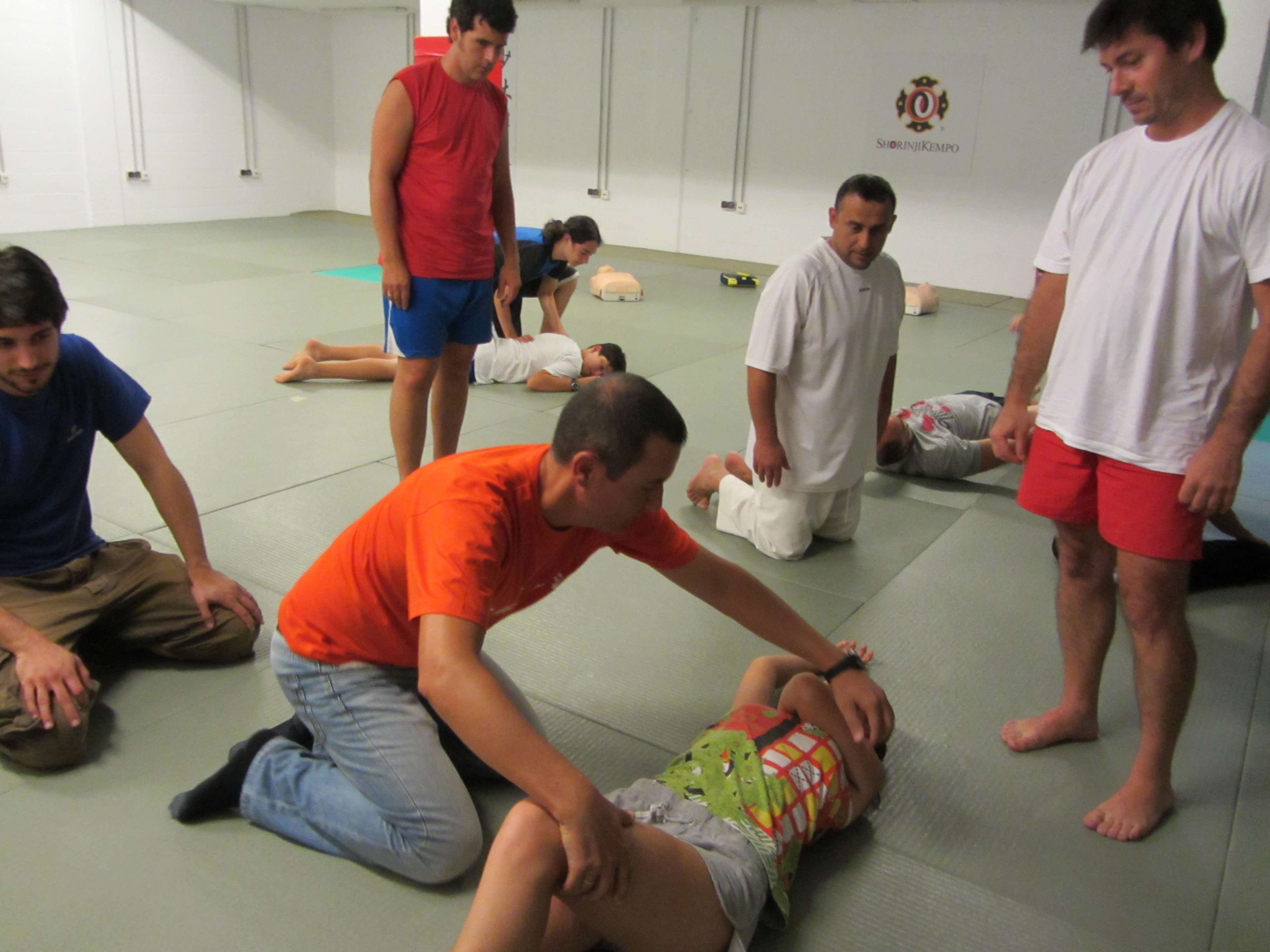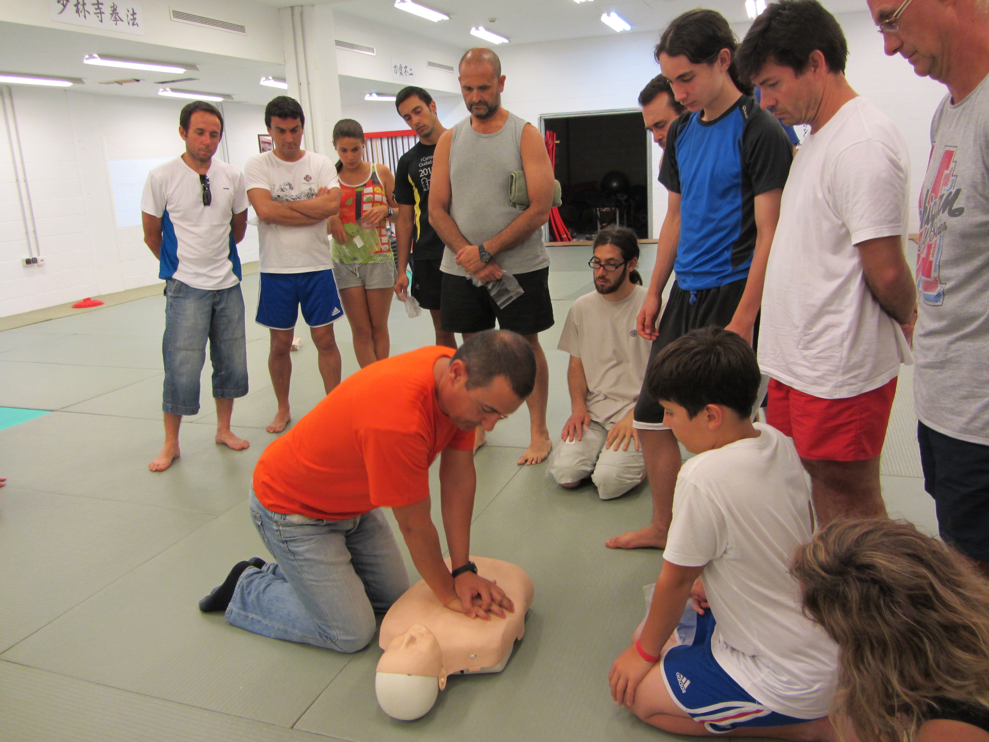 El pasado día 15 de julio de 2013, en el horario habitual de práctica (20:30 – 22:30), tuvo lugar una actividad formativa interna «extracurricular»: En esta ocasión ha tratado sobre primeros auxilios y ha sido organizada y dirigida por un kenshi de la sección: Nuestro compañero Eduardo Cervantes, que de manera totalmente desinteresada ha querido compartir sus conocimientos adquiridos gracias a 18 años de profesión en la empresa pública de emergencias 061 y ha preparado para nosotros esta actividad en la que, sin tratarse de ningún curso oficial (ni pretenderlo), ha conseguido resumir los conceptos más importantes y los conocimientos realmente imprescindibles para afrontar una situación de emergencia sanitaria durante el tiempo que transcurre hasta la llegada del equipo médico.