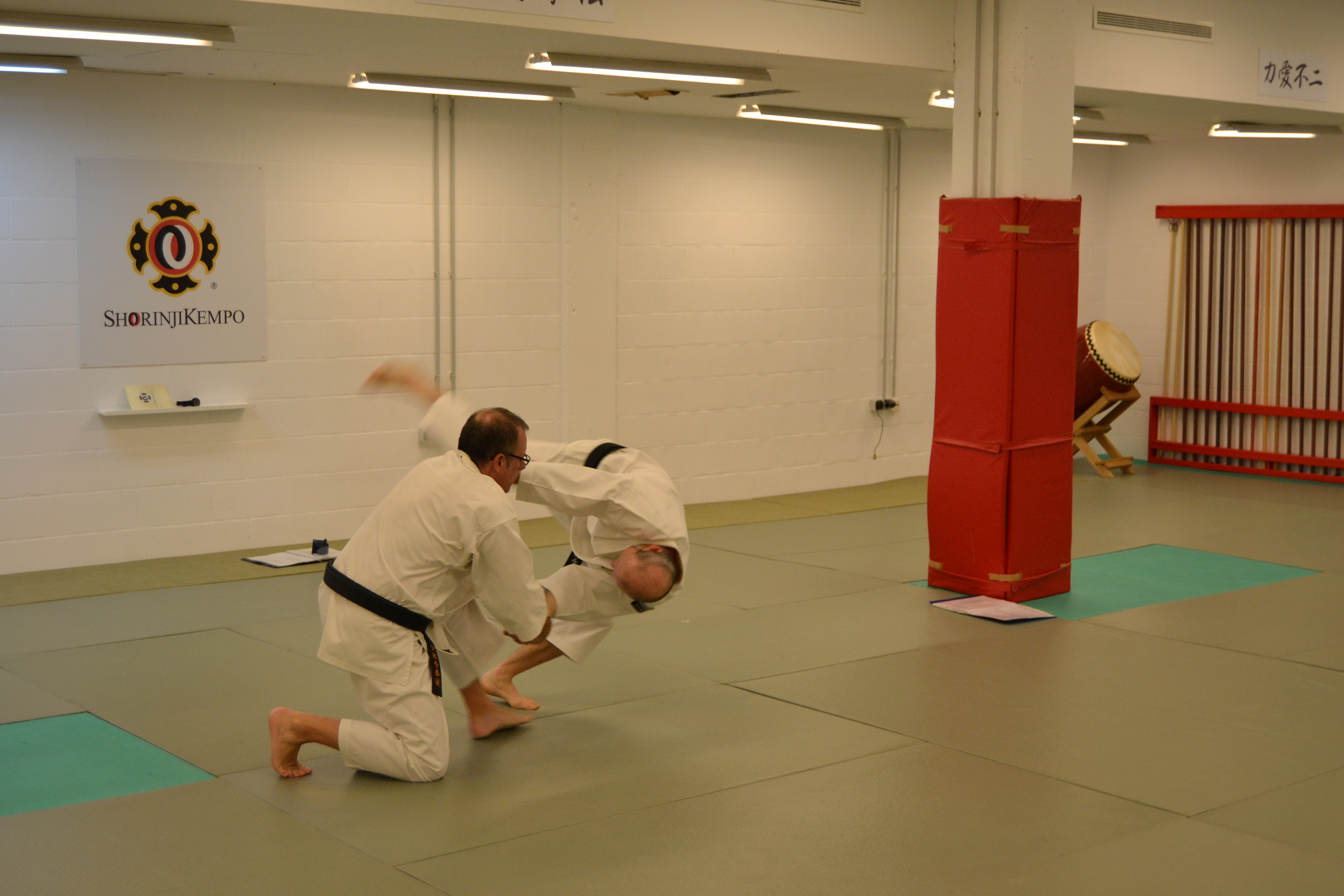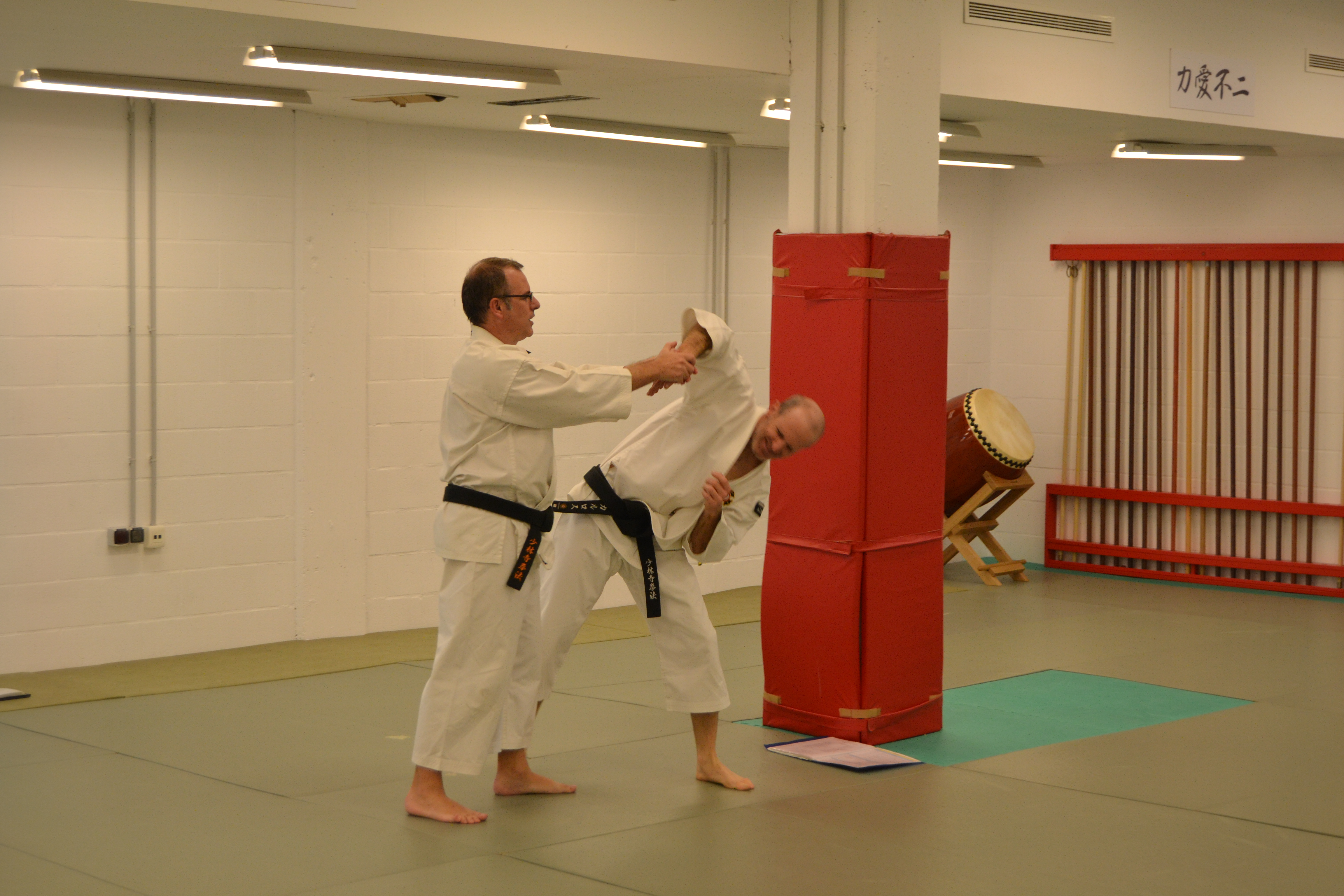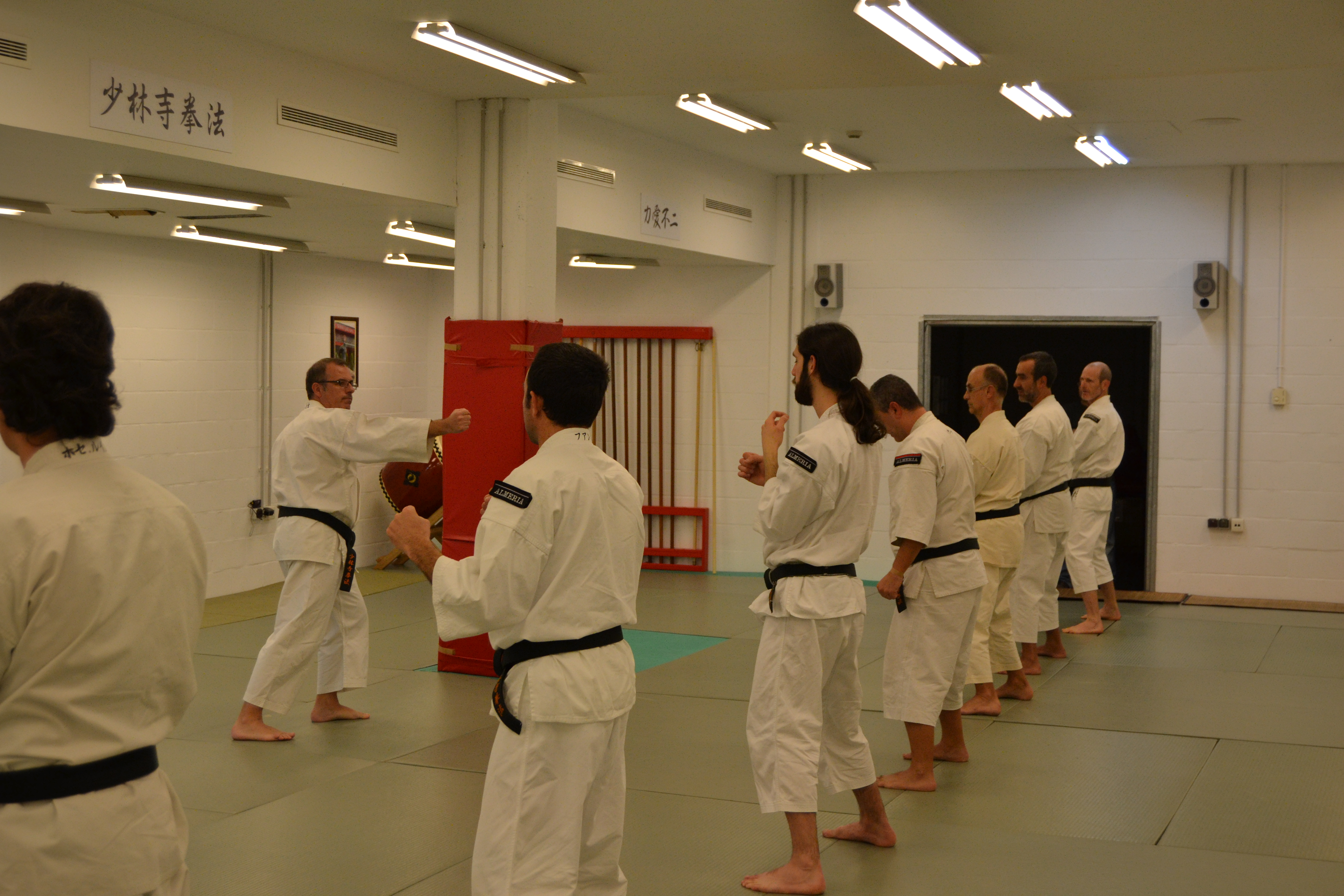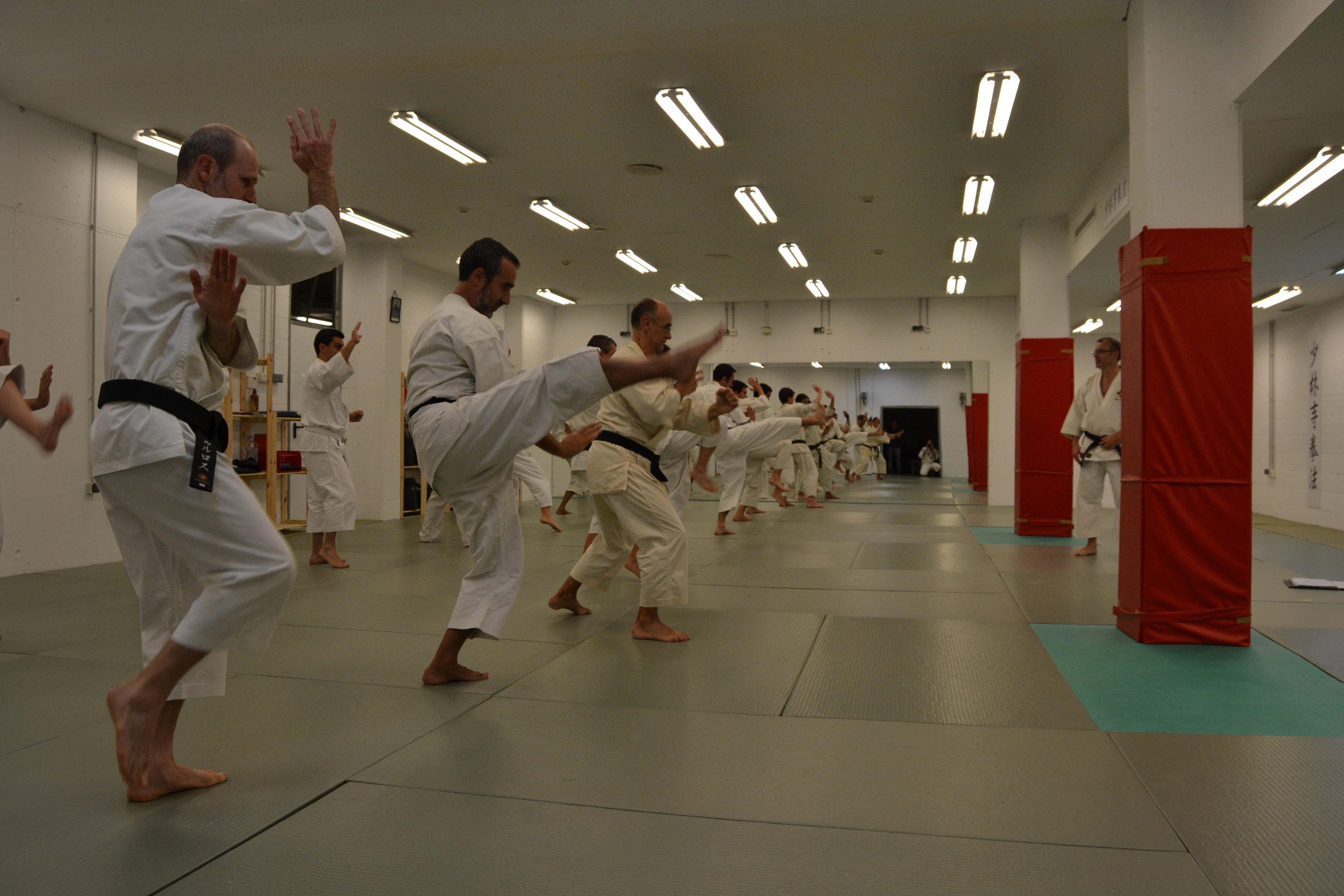 Rogelio Sensei condujo toda la sesión, dándonos como siempre pistas e indicaciones para mejorar nuestra práctica. Después de un completo calentamiento (Taiso), centró el kihon en combinaciones poco usuales dirigidas a mejorar la fluidez y a romper la rigidez que a veces produce la repetición de determinadas secuencias. En este sentido, en cuanto a goho, trabajamos por ejemplo defensas contra series de ataques comenzando con desvíos utilizando la mano atrasada (formas gyaku). También trabajamos los barridos, que es otra materia poco habitual en el programa. En juho, practicamos la continuidad de agarres y nukis obviando el tai sabaki, para obtener rapidez de reacción en los escapes. La última parte de la clase la dedicó a técnicas de desequilibrio y proyección más avanzadas, dirigidas a los grados altos, pero con las que todos pudimos experimentar. Así pues fue una clase muy interesante a la vez que divertida, en la que todos disfrutamos de los conocimientos del sensei.