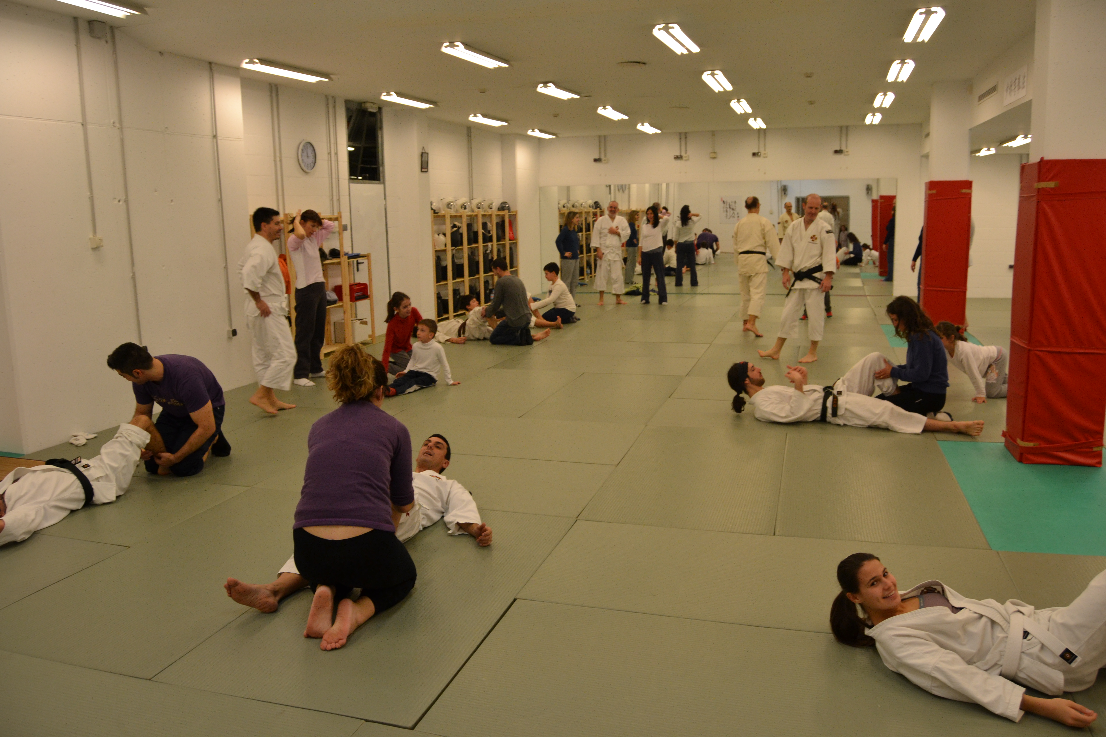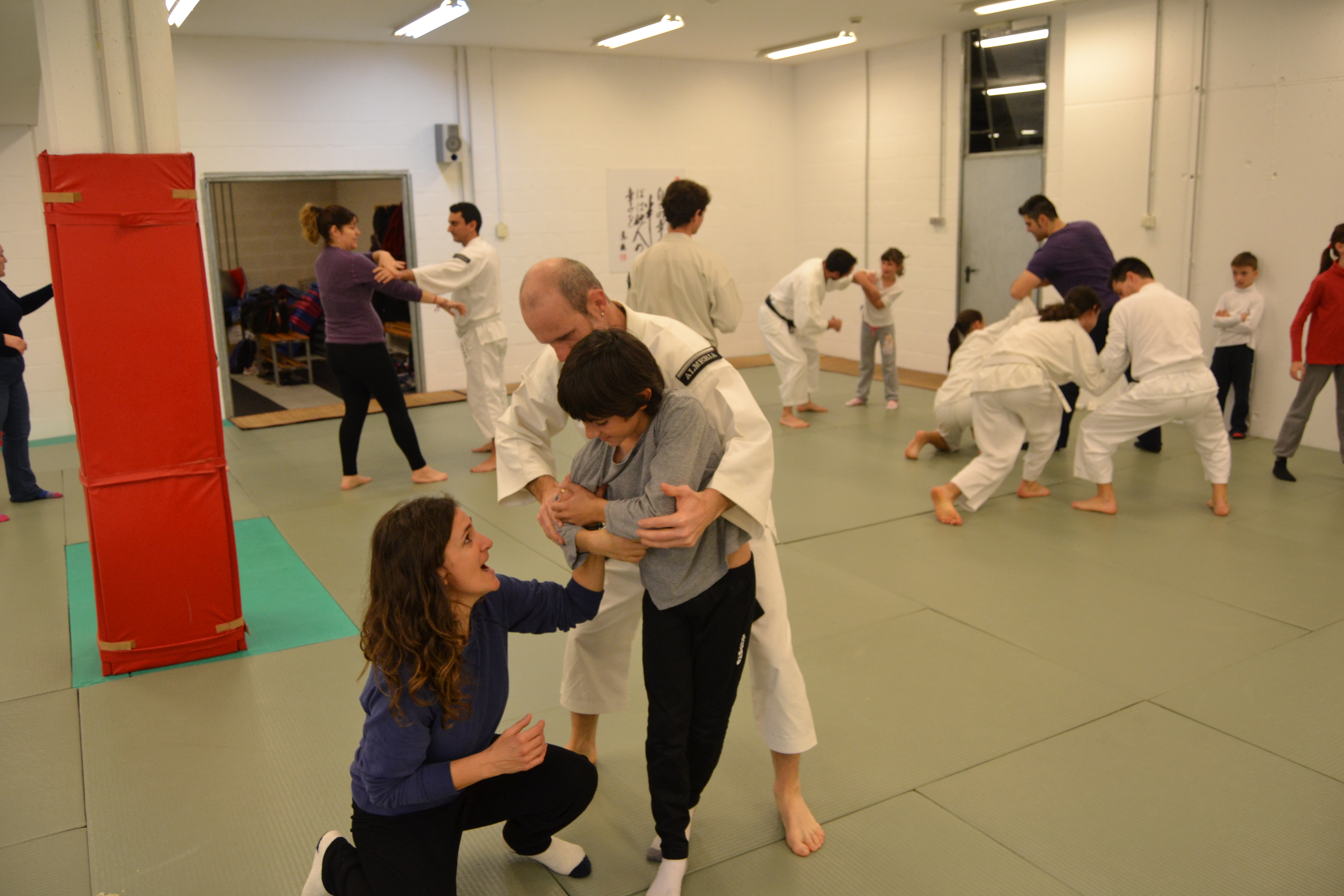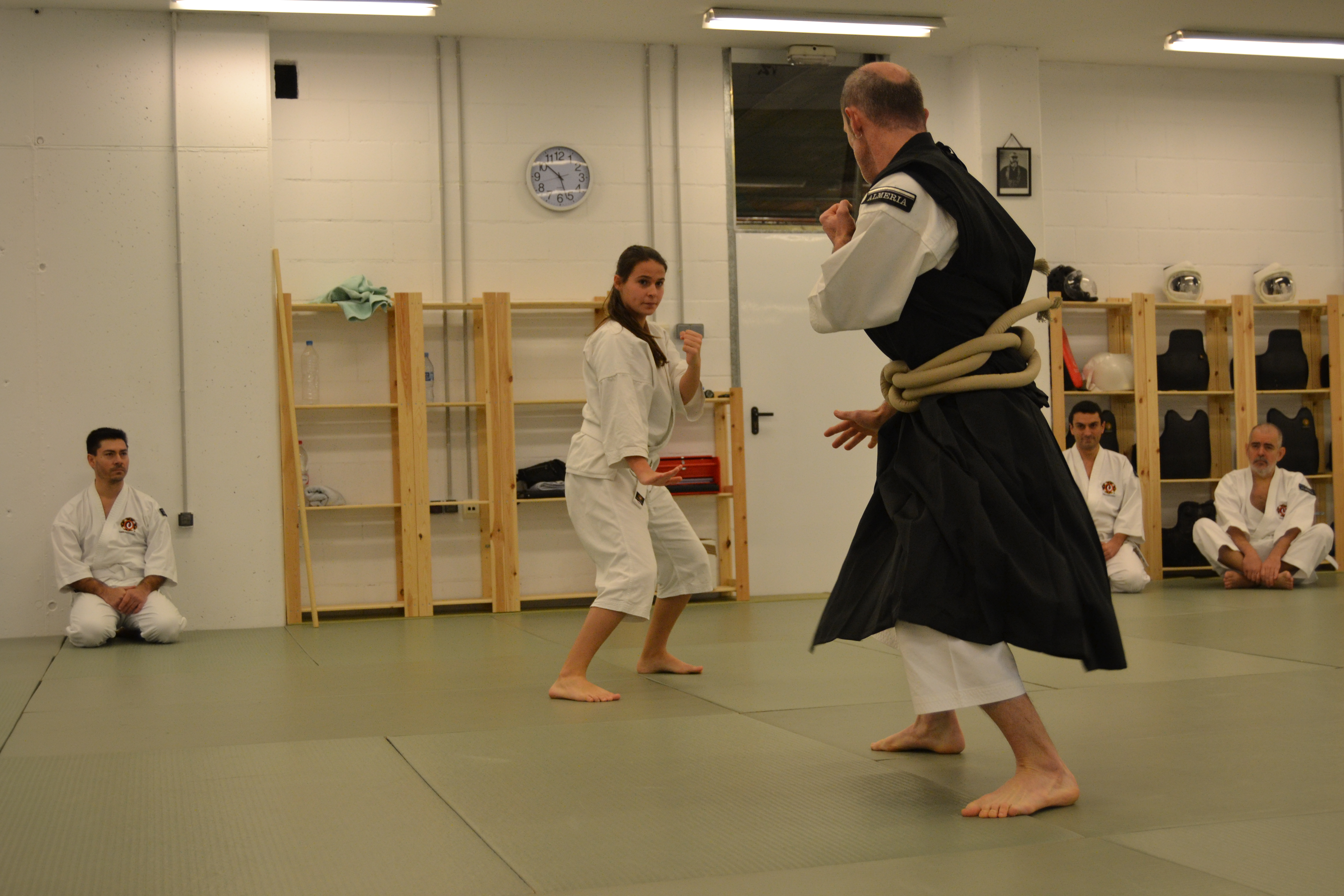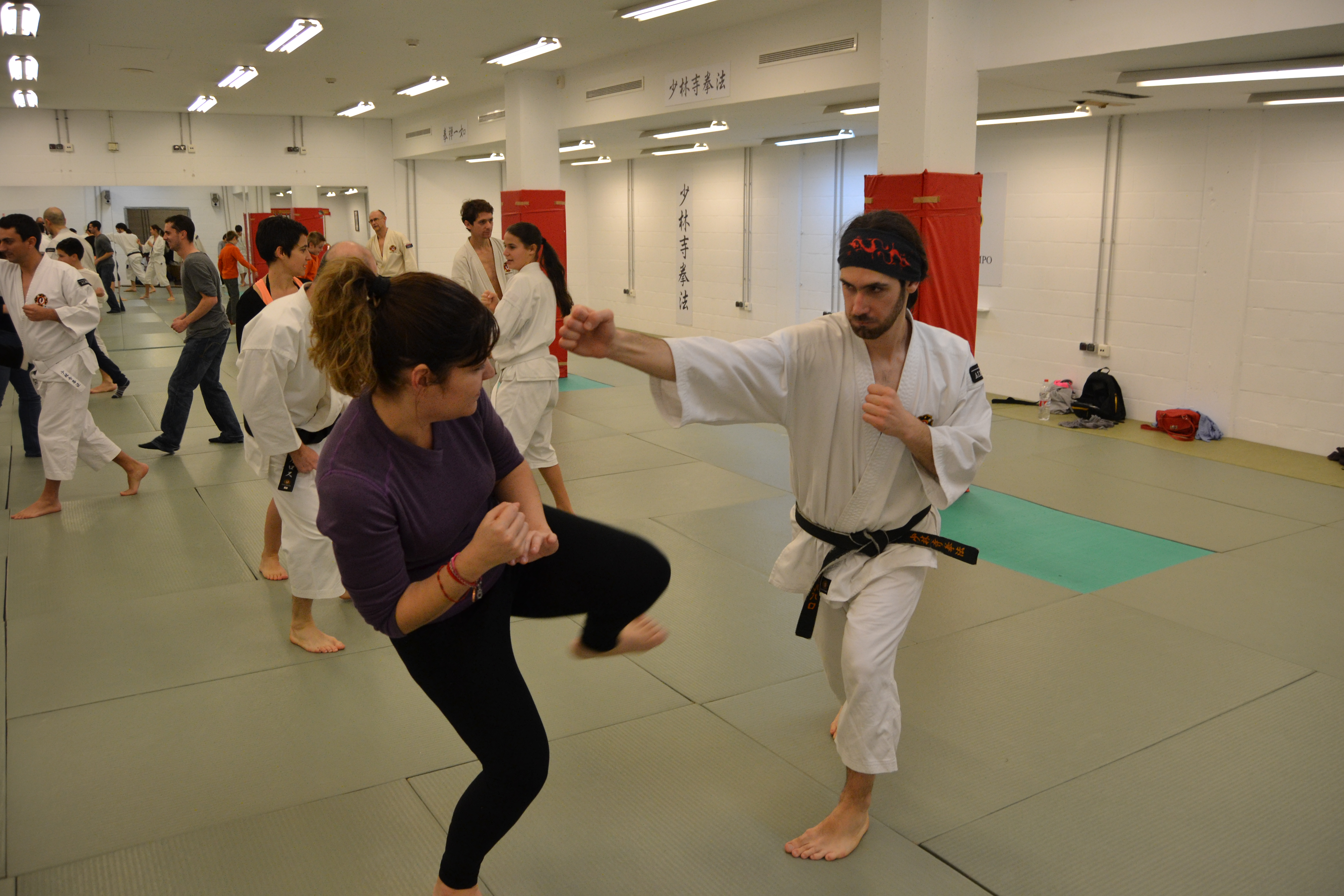 Después de esta presentación, el sensei preparó una clase especial para dar un conocimiento de primera mano sobre el Shorinji Kempo a nuestros seres queridos. En la misma participamos juntos kenshis y visitantes. Se trató de una práctica aparentemente sencilla pero muy completa, que permitió a todos los asistentes tomar contacto con los aspectos fundamentales del arte: Los fundamentos técnicos (kihon) más importantes, un par de técnicas goho («duras») con contraatques de pie y de puño para añadir variedad (ryusui geri y uchi uke zuki) y otro par de técnicas juho («suaves»), una representativa de nuki waza (escape, en este caso johaku nuki) y otra de gyaku waza (luxación, en este caso johaku dori).
