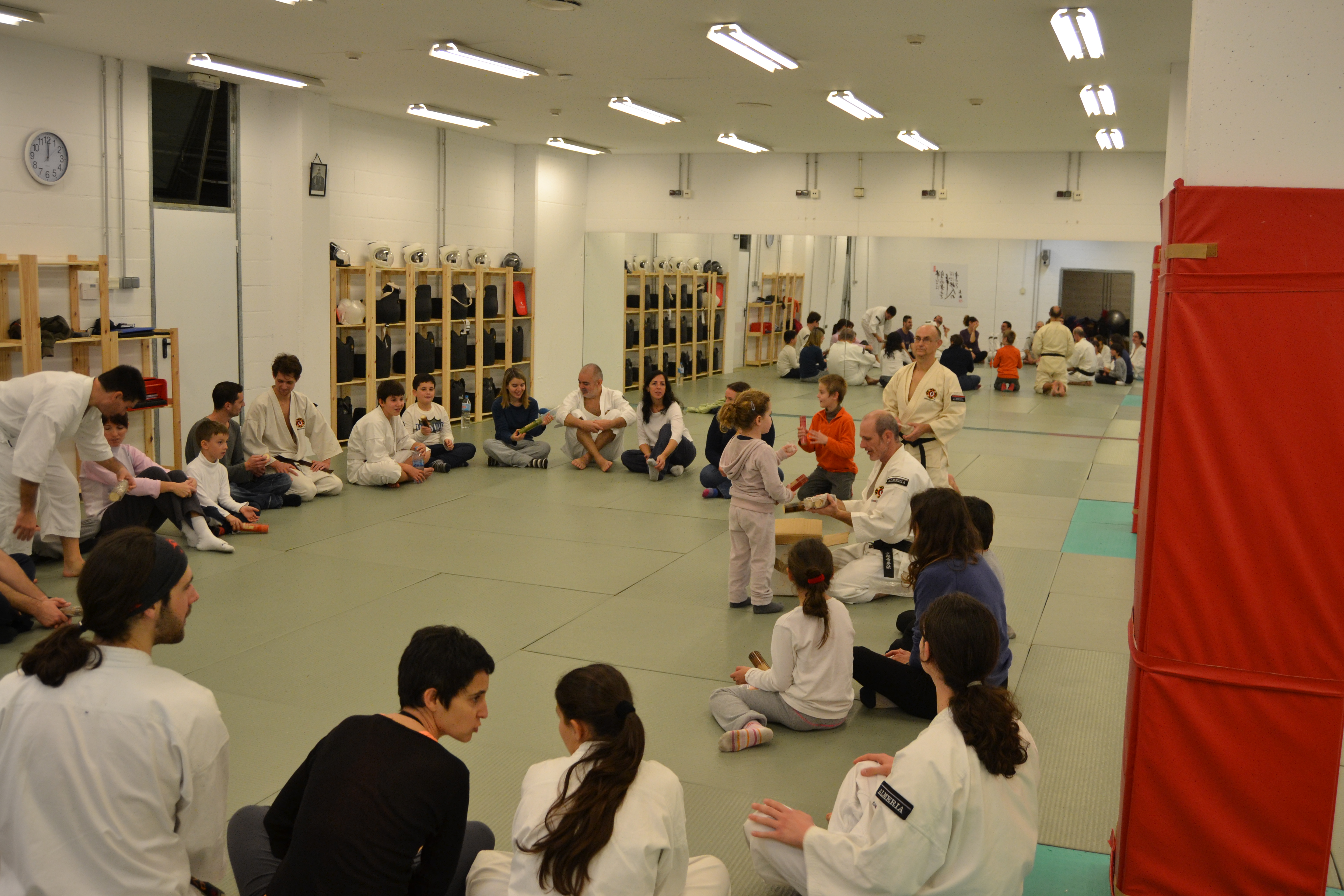 El sábado día 28 de diciembre de 2013, celebramos en nuestro dojo una jornada de convivencia para compartir con familiares y amigos la práctica de este arte tan querido por nosotros. A tal efecto, preparamos con todo nuestro cariño una pequeña exhibición que, tras unas palabras de bienvenida, ejecutamos para nuestros invitados y en la que realizamos tanen hokei individuales y por parejas (todos juntos al unísono), seguidos por técnicas del programa, esta vez por turnos, una pareja cada vez. Completó la exhibición un tanem hokei usando shakujo (bastón largo) y una secuencia de técnicas realizadas por el shibucho (jefe de sección) y los tres alumnos menores de edad con que actualmente cuenta nuestra sección, quienes tuvieron una actuación muy destacada.